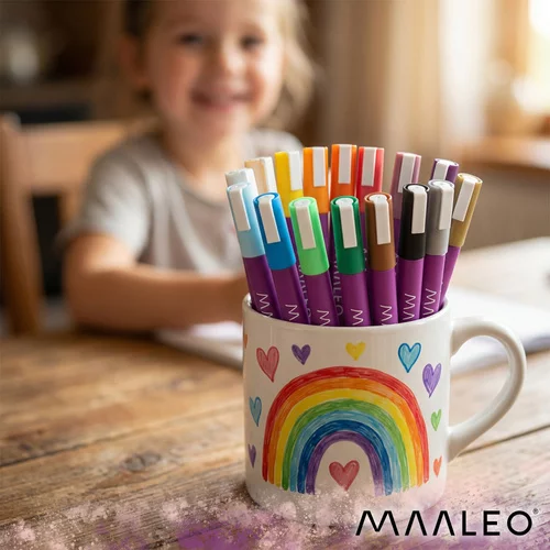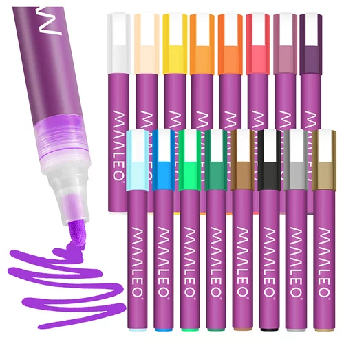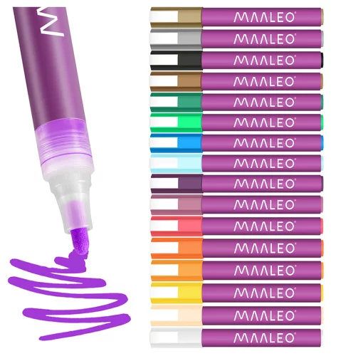 Akrylové fixy MAALEO obsahují pravou akrylovou barvu, nikoli běžný inkoust na vodní bázi. Díky tomu poskytují silné krytí, syté barvy a vysokou odolnost na široké škále povrchů. Jsou ideální pro malování, zdobení a kreativní projekty – od papíru po kámen, sklo nebo dřevo.