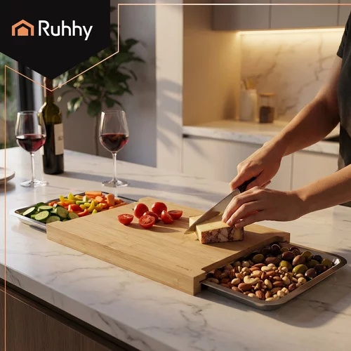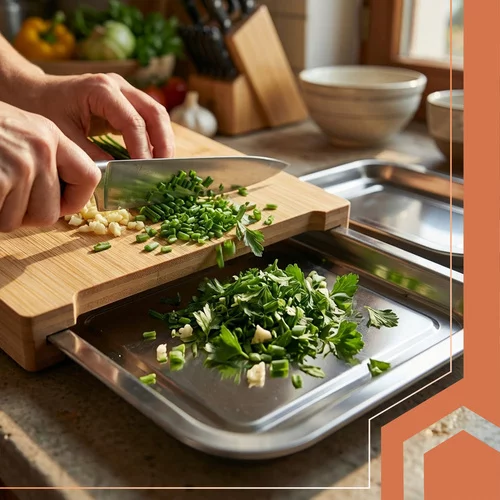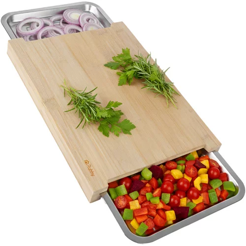 Prkénko usnadňuje krájení, třídění a přenášení surovin, díky dvěma výsuvným nádobám lze pracovat rychleji a čistěji. Přírodní bambus je odolný, hygienický a elegantní, zatímco ocelové nádoby umožňují pohodlné skladování nakrájených potravin nebo zbytků. Ideální pro efektivní vaření doma i v profesionálních kuchyních.