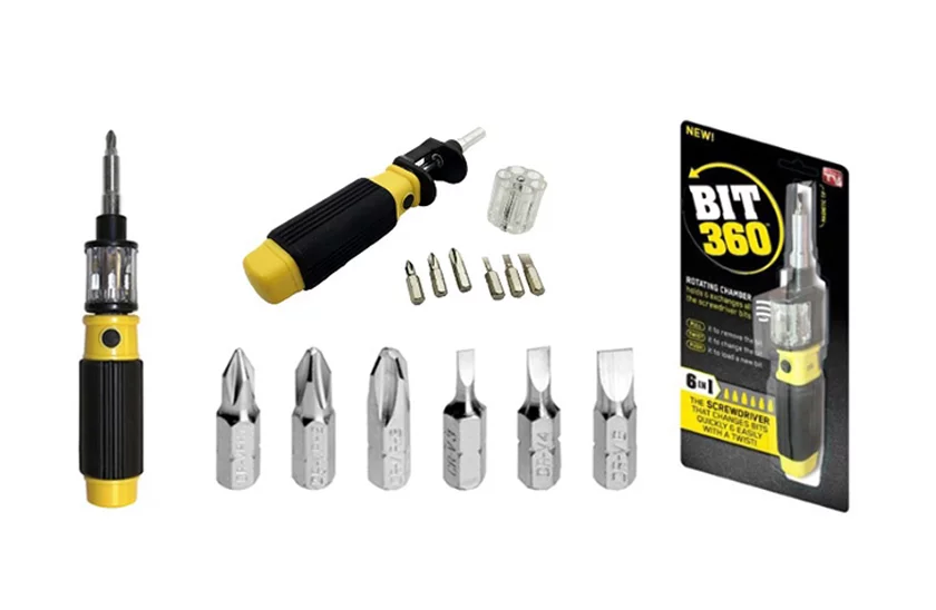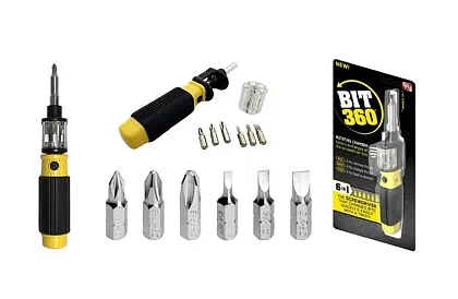 Praktický šroubovák BIT 360°. Hodí do každé dílny či domácnosti. Je malý, s bubnovým, průhledným výměníkem bitů a najdete ze zde přesně ty nástavce, které jsou vždy potřeba – plochý šroubovák, křížový i hvězdičkový. Profi nářadí s magnetickým jištěním a rychlou výměnou. Rozmontovat cokoliv, bude od teď hračka!