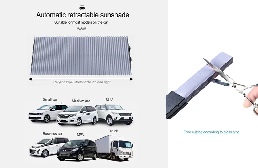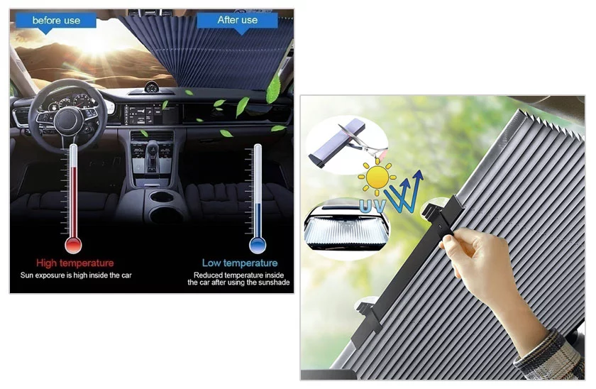 Nemůžete najít parkovací místo ve stínu, aby bylo vaše auto chráněné před horkem? Clona proti UV záření je ideálním řešením! Tato clona je neuvěřitelně multifunkční a univerzální, nejen že ochrání vaše vozidlo přes slunečním zářením ale také je vyrobena tak, aby se vešla do široké škály vozidel: dodávky, nákladní automobily, sedan a SUV! Jednoduše ji seříznete podle velikosti vašeho čelního skla a máte hotovo! Je to ta nejrychlejší sluneční clona do auta dostupná na trhu! Jedním tahem roztáhněte sluneční clonu zprava doleva a zavěste ji.