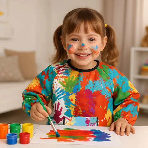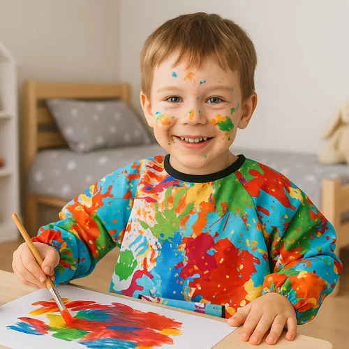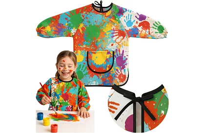Praktická malířská zástěra chrání oblečení před barvou, lepidlem i inkoustem a umožňuje dítěti svobodně tvořit. Dlouhé rukávy a volný střih poskytují plné krytí, zatímco elastické manžety a zavazování vzadu zajistí pohodlné nošení. Snadná údržba a odolný materiál umožňují dlouhodobé používání doma i ve školce. Barevný design zaujme malé umělce a motivuje je k aktivní hře a kreativnímu tvoření.