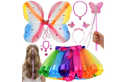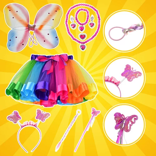 • Kompletní sada – křídla, duhová sukně, čelenka s tykadly, hůlka, ombré vlasy a šperky
