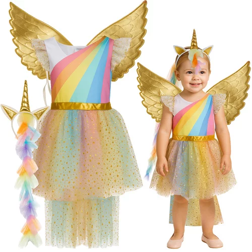 Kouzelný kostým promění každou malou princeznu ve hvězdnou postavu. Kompletní sada obsahuje šaty, zlatá křídla a čelenku s rohem, takže je připravená k okamžité hře, na karnevalový ples, halloweenskou párty, narozeninovou oslavu nebo školní představení. Kostým je lehký, pohodlný a univerzální, takže dítě může své kouzlo nosit po celý rok.