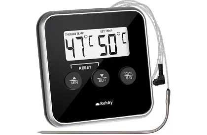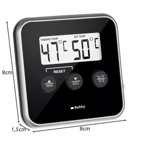 Tento teploměr je ideálním pomocníkem při přípravě masa, tekutin nebo olejů a umožní vám snadno kontrolovat teplotu s přesností až na jeden stupeň. Velký a přehledný LCD displej zajišťuje snadné čtení hodnot, zatímco magnet na zadní straně umožňuje připevnění teploměru na kovové povrchy, jako je lednička, trouba nebo gril. Funkce zvukového alarmu vás upozorní, jakmile teplota dosáhne nastavené hodnoty, a praktický časovač usnadní přesné sledování doby vaření.