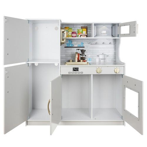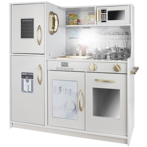 Stylová dřevěná kuchyně XL nabízí dětem realistický zážitek z vaření plný světelných a zvukových efektů. Díky LED lampě, pohyblivým částem a bohatému příslušenství si děti mohou hrát na skutečné kuchaře, rozvíjet fantazii a učit se hrou. Kuchyně je bezpečná, odolná a navíc krásně doplní dětský pokoj.