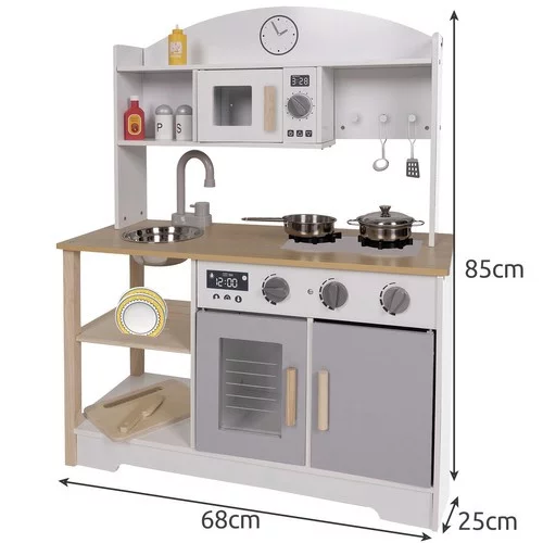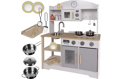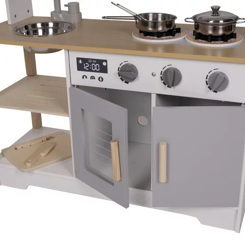 Fantastická dřevěná kuchyňka, která povzbuzuje dětskou fantazii, podporuje kreativitu a umožňuje hodiny zábavy při hře na vaření. Analogové hodiny, pohyblivé knoflíky, otvírací dveře a vyjímatelný dřez přinášejí realistický zážitek, který učí děti samostatnosti a základům vaření. Součástí jsou také praktické doplňky, které napodobují skutečné kuchyňské prostředí.