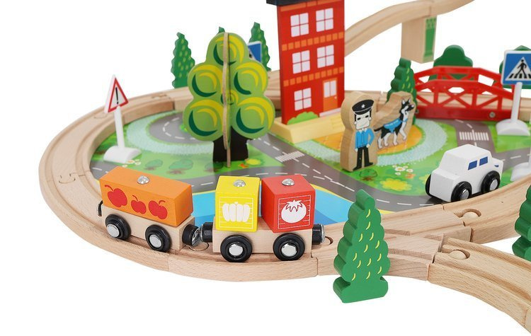 Rozvíjejte dětskou fantazii a kreativitu s touto dřevěnou železnicí. Sada obsahuje 88 precizně vyrobených dílků, které si děti mohou poskládat podle vlastních představ. Souprava zahrnuje dráhu, osobní a nákladní vlak, auto, stromky, dopravní značky, figurky, policejního psa, překladiště s jeřábem a desku napodobující silnici pro auto. Všechny části vláčku jsou propojeny magnety, takže nedojde k nechtěnému oddělení a hraní je bezproblémové.