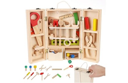 Malý kutil si díky této dřevěné sadě nářadí užije hodiny zábavy a zároveň rozvíjí jemnou motoriku, kreativitu a logické myšlení. Krabice s pohodlným madlem a vnitřními přihrádkami umožňuje udržet pořádek a všechny nástroje mít vždy po ruce. Sada je bezpečná, odolná a ideální pro první stavební pokusy dětí.