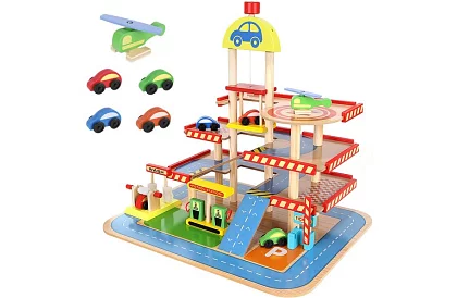 Velká dřevěná garáž přináší spoustu zábavy pro malé motoristy. Děti si užijí realistické parkoviště s auty, vrtulníkem a čerpací stanicí, které podporuje kreativitu, manuální zručnost a prostorovou představivost. Díky bezpečným dřevěným prvkům mohou hrát bez obav, a hra je zároveň skvělou příležitostí pro společné chvíle s rodiči či vrstevníky.
