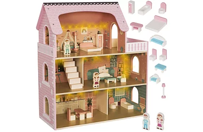 Velký dřevěný domeček pro panenky se 3 patry nabízí prostor pro nekonečné kreativní hraní. Pevná konstrukce z hladce opracovaného dřeva zajišťuje bezpečnost i dlouhou životnost. Díky bohaté sadě nábytku je připraven k okamžitému hraní bez nutnosti dokupování doplňků. Integrované LED osvětlení dodává domečku realistickou atmosféru a promění hru v kouzelný zážitek i ve večerních hodinách. Ideální jako dárek, který spojuje zábavu, fantazii a rozvoj dětské kreativity.