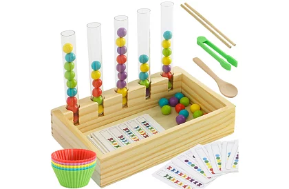 Zábavná forma učení, která přirozeně rozvíjí jemnou motoriku, koordinaci ruka–oko a první matematické dovednosti. Barevné třídění a práce s kartami podporují logické myšlení, soustředění i trpělivost. Kvalitní dřevěné zpracování zajišťuje dlouhou životnost a představuje smysluplnou investici do rozvoje dítěte.
