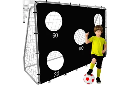 Branka je vybavena zaměřovací podložkou pro nácvik přesných střel. Při její montáži je viditelné pouze 5 otvorů, do kterých lze vstřelit gól, každý s přiřazeným počtem bodů. Panel se upevňuje pomocí speciálních gumiček. Stabilní ocelový rám zajišťuje bezpečnost při hře a součástí sady jsou kolíky pro upevnění k zemi. Díky klik systému je branka rychle složitelná a rozložitelná, ideální pro tréninky i zábavu doma či venku.