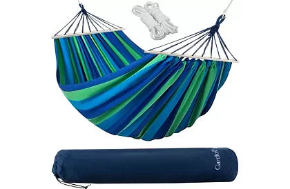 Pohodlná houpací síť pro dvě osoby je ideální pro odpočinek na zahradě, terase nebo v interiéru. Vyrobena z příjemné bavlny s malým množstvím polyesteru, zajišťuje komfort i správné odvětrávání. Díky dřevěným příčkám se rozkládá jako postel a umožňuje volné ležení, čtení či relaxaci. Součástí balení jsou lana a kryt pro snadnou montáž i přenášení, takže si odpočinek můžete užít kdekoliv.