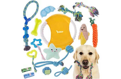 Velká sada hraček pro psy PURLOV 16 v 1 kombinuje zábavu a péči o zdraví vašeho mazlíčka. Lanové hračky podporují dentální hygienu, masírují dásně a pomáhají odstraňovat zubní kámen při hraní. Sada obsahuje různé hračky pro tahání, žvýkání a aportování, vše vyrobené z bezpečných a odolných materiálů, aby vydržely i intenzivní hru a byly bezpečné.