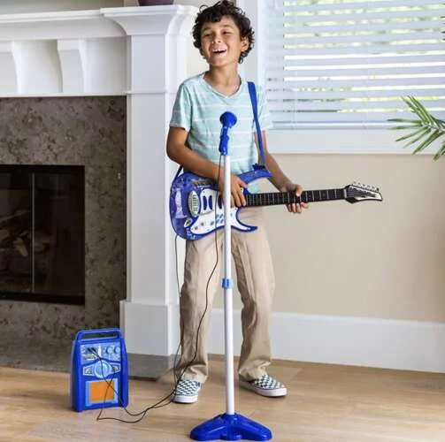 Fantastická hudební sada pro děti, která kombinuje kytaru, zesilovač a mikrofon, promění každou domácí zábavu ve skutečný koncert. Díky vstupu MP3 může dítě hrát a zpívat s oblíbenými písněmi, což pomáhá překonat trému před vystoupením. Blikající světla doprovázejí hudbu a přidávají show efekt, zatímco mikrofon s tlačítkem zap/vyp umožňuje kontrolu nad vystoupením. Sada je napájena bateriemi, takže ji lze snadno přenášet a použít kdekoliv, bez starostí o připojení k elektrické síti.