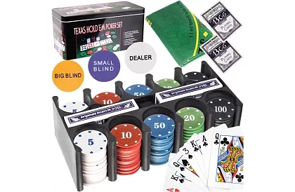 Kompletní sada pro hraní Texas hold'em a dalších karetních her poskytuje vše, co hráč potřebuje