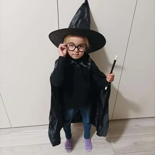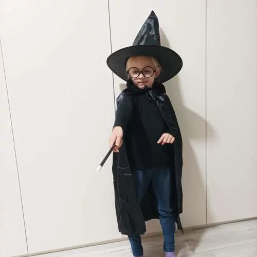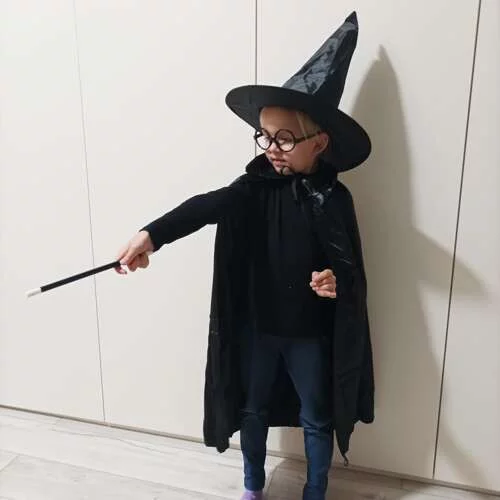 Kostým kouzelníka promění každé dítě v malého čaroděje. Černá plášť dodává tajemno a eleganci, vysoký klobouk překvapí efektním rozložením a kouzelná hůlka spolu s kulatými brýlemi dokonale dotváří magickou postavu. Ideální pro kostýmní večírky, divadelní představení nebo hru doma, kdy fantazie nezná hranic.