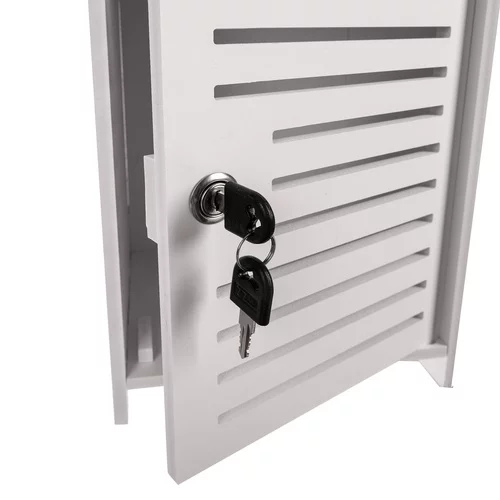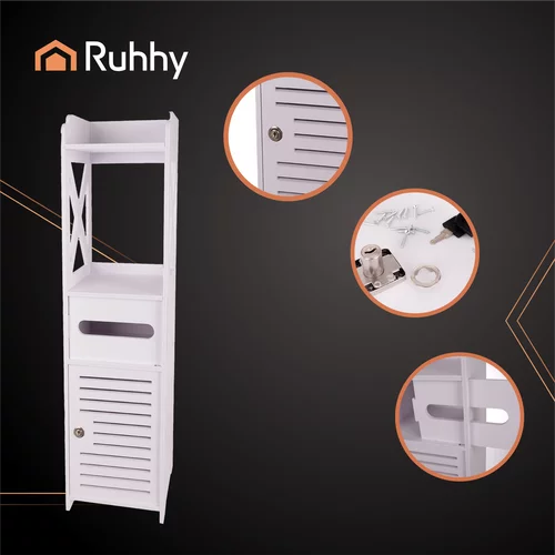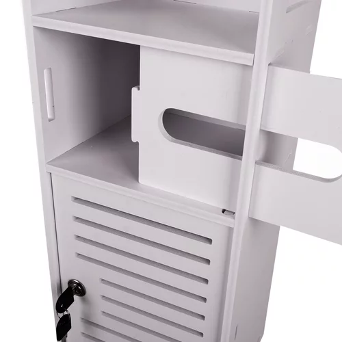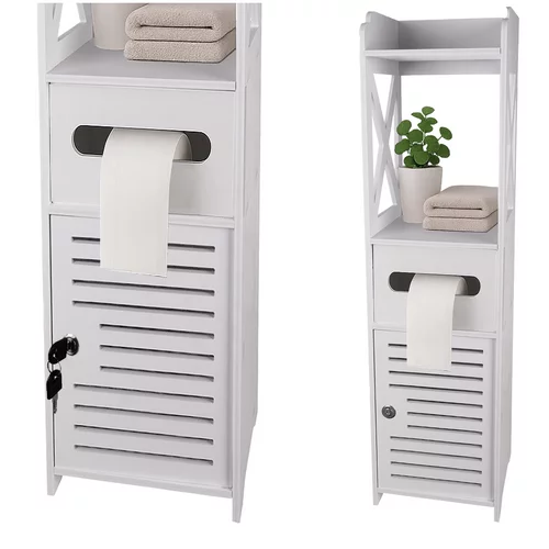 Praktický koupelnový sloup v elegantní bílé barvě pomůže udržet pořádek i v menší koupelně. Kompaktní provedení nabízí dostatek úložného prostoru na kosmetiku, čisticí prostředky i toaletní papír, zatímco vestavěný držák umožňuje jeho hygienické a rychlé použití. Prolamovaná dvířka dodávají skříňce lehký a moderní vzhled a zároveň zajišťují přirozenou cirkulaci vzduchu. Uzamykatelné provedení chrání obsah před dětmi i nežádoucím přístupem.
