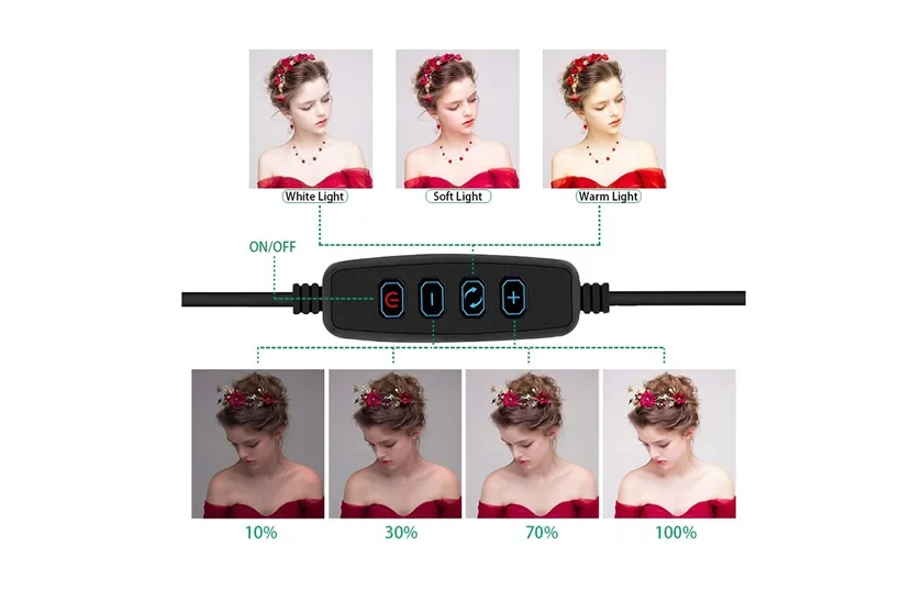 Na vypínači, který je na napájecím kabelu, si můžete nastavit tři druhy teploty světla a 10 intenzit svícení. Světlo můžete napájet přímo přes USB port počítače nebo ze sítě přes libovolný adaptér (není součásti balení).