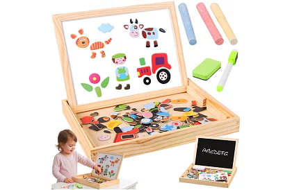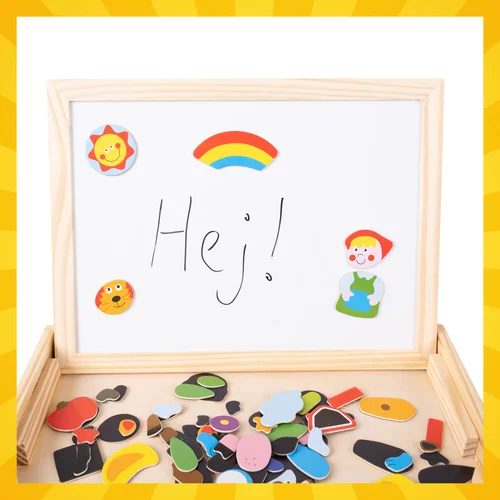 Oboustranná učící tabule podporuje kreativní hraní a učení hrou pro děti od 3 let. Děti mohou kreslit, aranžovat magnety a vytvářet vlastní obrázky, což rozvíjí jemnou motoriku, logické myšlení a představivost. Dřevěná konstrukce a 108 barevných dílků zajišťují odolnost a mnoho možností pro tvoření.