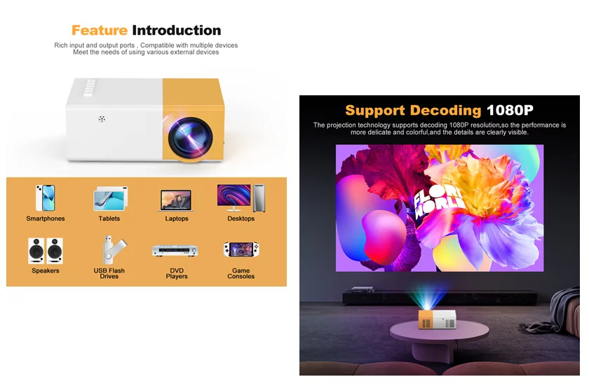 Jednoduše vložíte flashku s filmem do USB vstupu a pár pohyby na ovladači si pustíte film u vás doma. Pomocí HDMI vstupu můžete svůj počítač propojit s projektorem a použít ho například pro obrázkovou prezentaci. Projektor podporuje připojení k počítači, notebooku, tabletu a mobilu. Široká kompatibilita nabízí více možností pro přehrávání videí, her, obrázků či hudby.