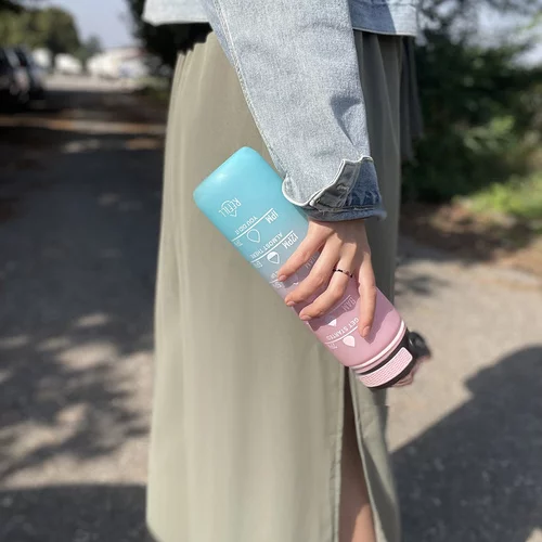 Motivační láhev poskytuje praktický a bezpečný způsob hydratace během celého dne. Je vyrobena z odolného a zdravotně nezávadného PP materiálu s měkkým silikonovým náustkem, který je bezpečný pro zuby a dásně. Díky odnímatelné trubici není nutné láhev naklánět a její pastelové barvy dodávají estetický a módní vzhled vhodný pro každodenní použití. Lze ji používat s tekutinami od -20 °C do 80 °C.