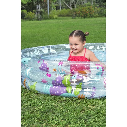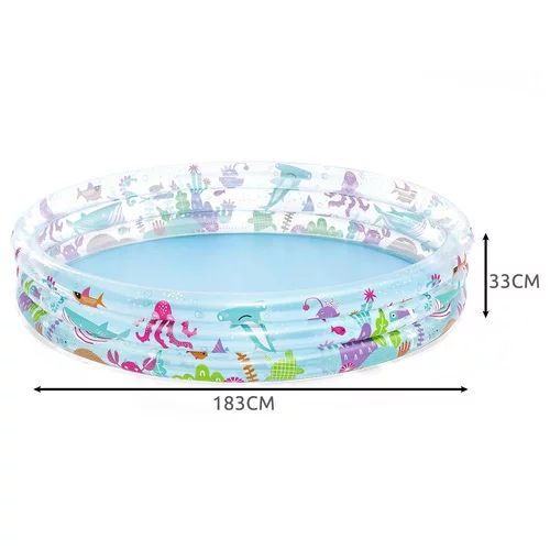 Dopřejte dětem osvěžení a spoustu zábavy během horkých dnů s praktickým nafukovacím bazénem. Díky prostornému kulatému provedení nabízí dostatek místa pro vodní hry na zahradě i terase. Tři samostatně nafukovací kruhy zvyšují stabilitu a usnadňují přípravu k použití. Bazén lze využít nejen s vodou, ale také jako hrací prostor s míčky nebo hračkami.
