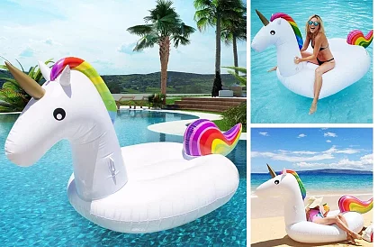 Krásná obří nafukovací matrace na vodu v designu unikátního barevného jednorožce. Nafukovací jednorožec oživí nejednu zahradní párty u bazénu. Výborná letní dekorace nejen na dovolenou, kterou musíte mít. Jděte s dobou a pořiďte si i vy toto nafukovací lehátko. Uvidíte, jak ve vodě zazáříte!