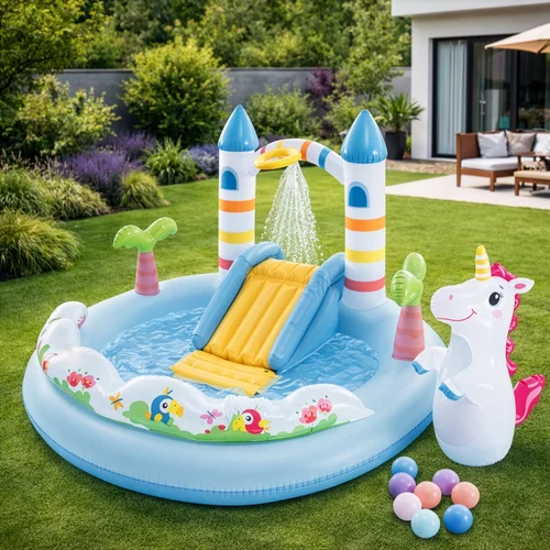 Horko, nuda a děti plné energie? Toto nafukovací vodní hřiště ve tvaru pohádkového hradu promění vaši zahradu v malý aquapark. Stačí připojit zahradní hadici a zábava může začít.