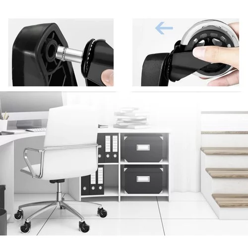 Sada náhradních koleček je ideální pro kancelářské, herní, otočné i dětské židle. Vyrobena z kvalitní pryže chrání podlahu před poškrábáním a zároveň zajišťuje tichý a hladký pohyb židle. Instalace je snadná díky systému push-and-click, takže během chvilky můžete dát vašemu křeslu nový život.