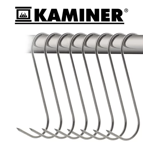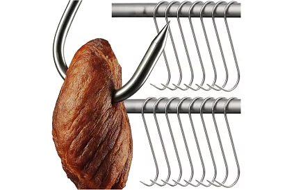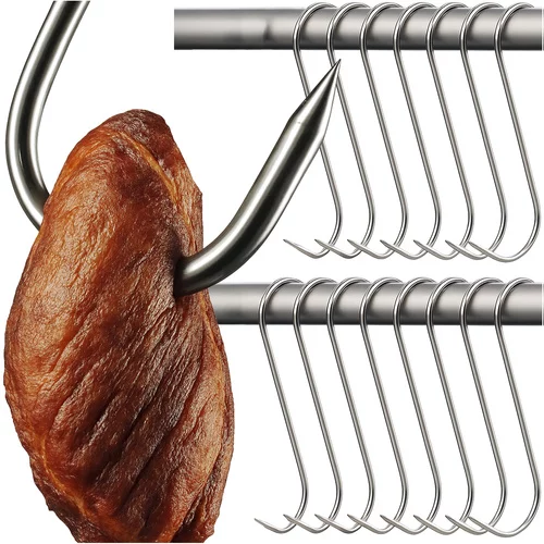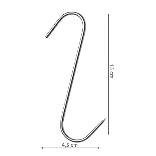 Sada háků z nerezové oceli nejvyšší kvality je ideální pro uzení masa a ryb. Odolné vůči rzi, vysokým teplotám a vlhkosti, poskytují bezpečné a spolehlivé zavěšení. Špičatý hrot a tvar „S“ umožňují snadné propíchnutí masa a stabilní zavěšení na tyči udírny. Baleno v praktické sadě 15 kusů, připraveno k okamžitému použití.