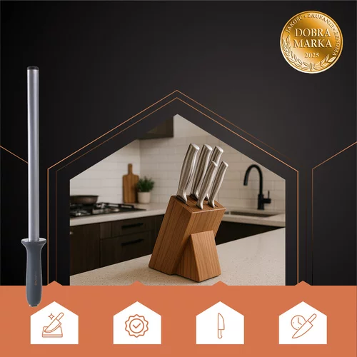 Zajišťuje, že nože jsou ostré jako nové přímo z továrny díky diamantovému povrchu, který umožňuje rychlé, rovnoměrné a efektivní ostření bez poškození čepele. Ergonomická rukojeť a pevná ocelová tyč poskytují pohodlnou a bezpečnou práci, ideální pro profesionální i domácí kuchyně.