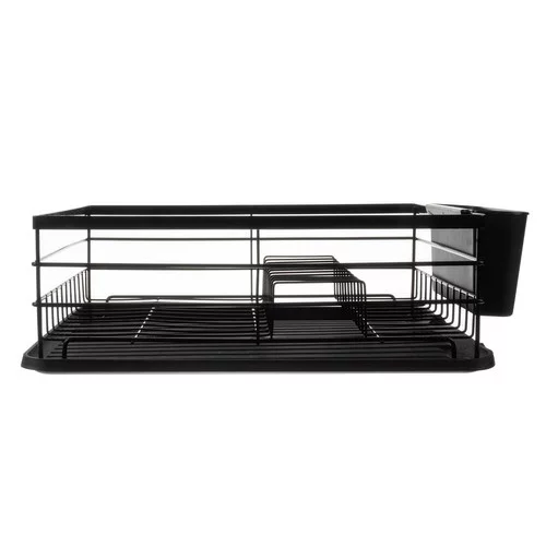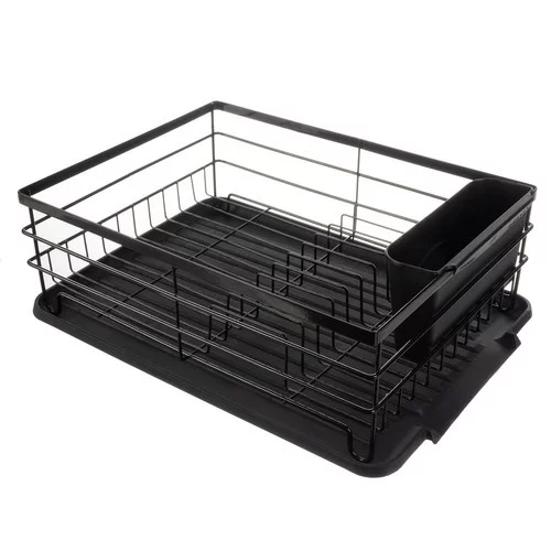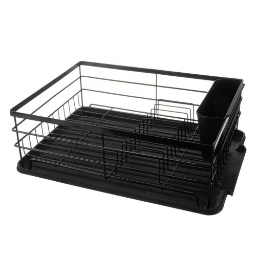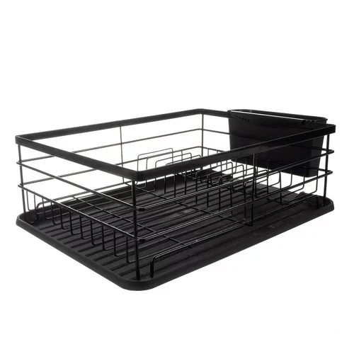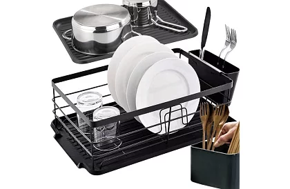 Praktický a stylový odkapávač na nádobí z kvalitního pochromovaného kovu s loftovým designem, který se hodí do každé kuchyně. Díky odnímatelnému zásobníku na příbory a snadnému odtoku vody udrží nádobí suché a uspořádané. Odkapávač zajišťuje hygienické sušení talířů, hrnků i příborů bez zbytečného kapání vody po kuchyňské lince.