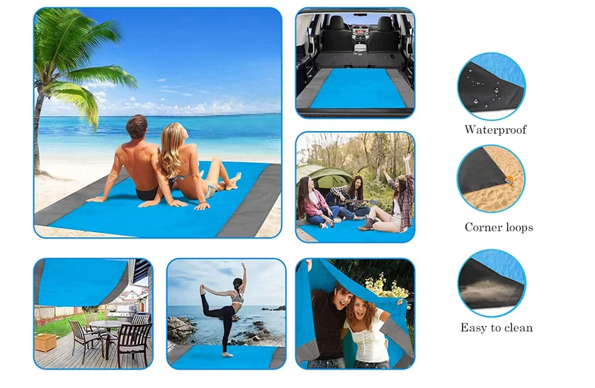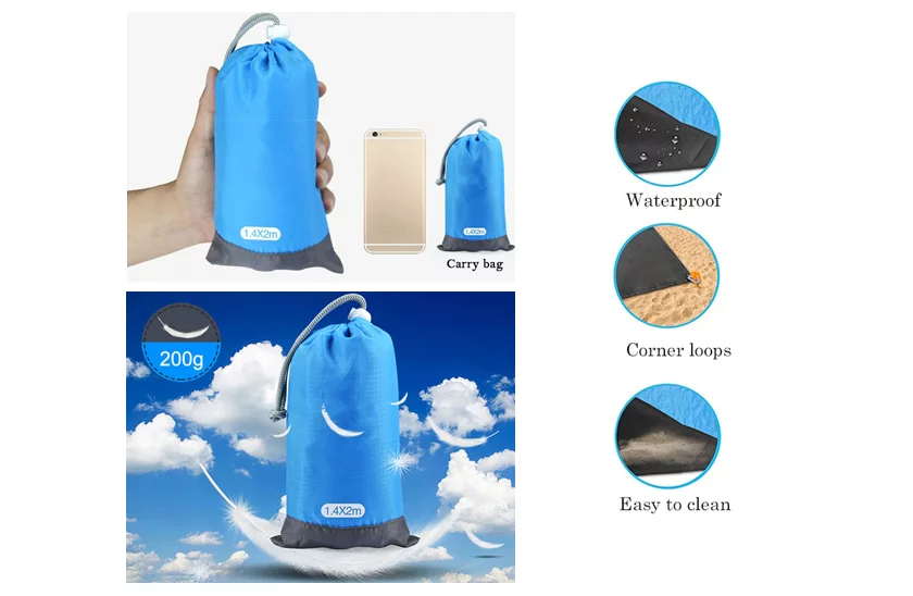Pokrývá 210×200 cm prostoru, což je dost pro mnoho outdoorových aktivit. Plážová podložka je vyrobena z odolného nylonu, což je nepromokavý materiál. Poskytuje pohodlí při používání a má vynikající vlastnosti pro použití na různých površích a povětrnostních podmínkách. V balení jsou fixační pomůcky, díky kterým se podložka nebude hýbat a bude stabilní.