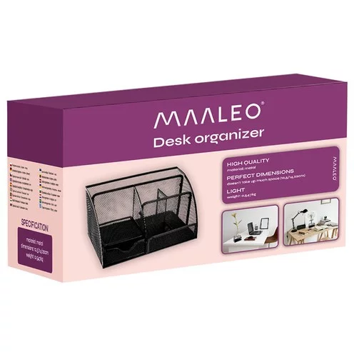 Praktický stolní organizér vám umožní mít všechny kancelářské potřeby po ruce a udržet pracovní plochu uklizenou. Díky velké a pěti menším přihrádkám, zásuvce i policím snadno uložíte pera, pastelky, fixy, gumy, kancelářské sponky, lepidlo nebo nůžky. Organizér je odolný a pevný, takže vydrží dlouhodobé používání doma i v kanceláři.