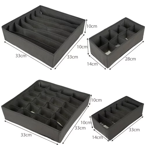 Praktická sada čtyř organizérů, která zajistí pořádek ve vašich zásuvkách i skříních. Každý organizér je vhodný pro jiný typ spodního prádla a pomáhá rychle najít to, co potřebujete. Díky skládací konstrukci a prodyšnému materiálu jsou organizéry pohodlné, odolné a snadno se udržují.