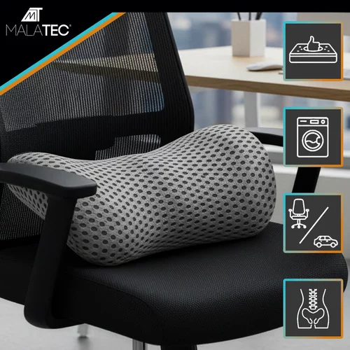 Podporuje správné držení těla a přirozené zakřivení páteře při sezení. Paměťová pěna se přizpůsobuje tvaru zad a poskytuje komfortní bederní oporu, snižuje tlak na páteř a napětí svalů. Ideální na kancelářské židle, autosedačky nebo domácí sezení, kde ergonomie není optimální.