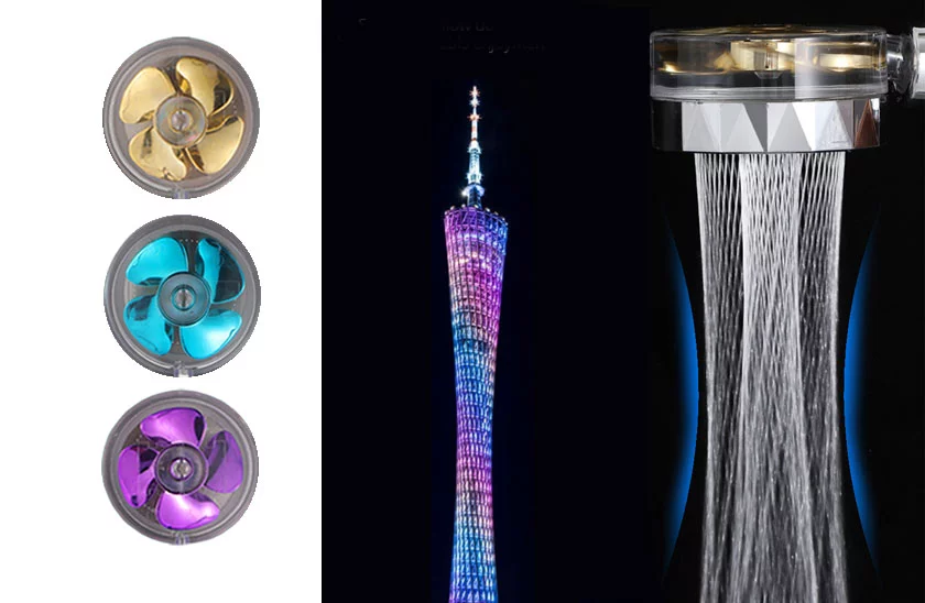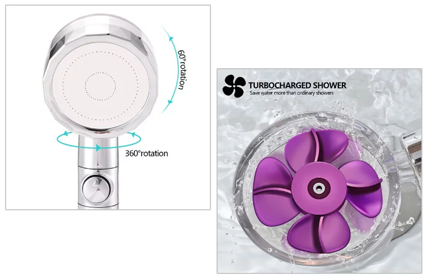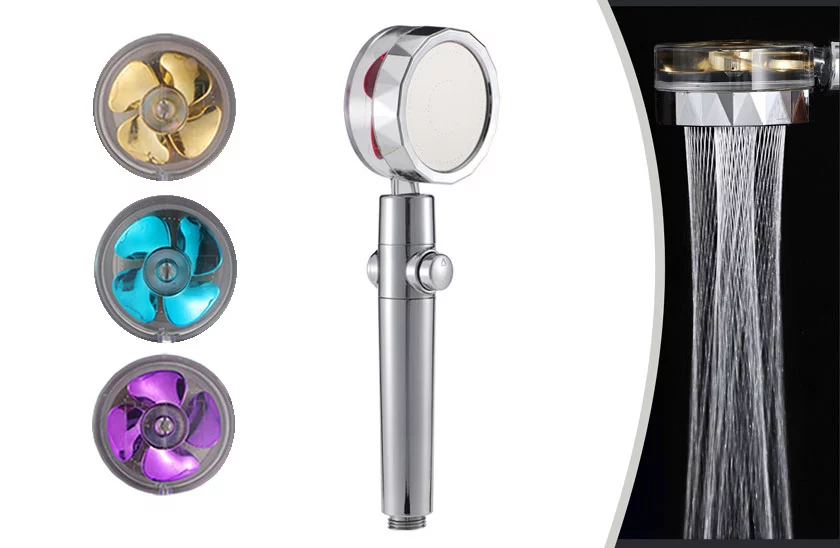 Originální sprchová hlavice TurboShower s malým ventilátorem uvnitř. Hlavice poskytuje zvýšený průtok vody i lepší tlak než u klasických sprchových hlavic. Sprchová hlavice zaujme i svým netradičním proudem vody, který připomíná spirálový paprsek. Proud vody lze zastavit stlačením kolíčku „STOP“, což zvládnete pouze jednou rukou a druhou si pohodlně namydlíte vlasy. Díky mnoha speciálně navrženým tryskám ušetříte až 30 % vody ročně. To se může samozřejmě znatelně projevit i na vyúčtování za vodu.