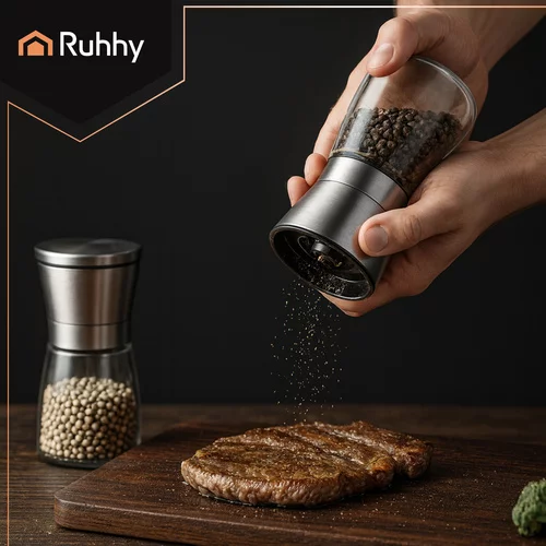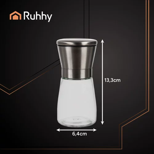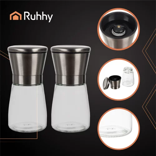 Elegantní a praktická sada skleněných mlýnků RUHHY nabízí možnost čerstvého mletí koření přímo při vaření či servírování. Průhledné sklo umožňuje kontrolu množství koření, kovové víko dodává moderní vzhled a keramický mechanismus zajišťuje přesné ruční mletí pro plnou chuť a aroma každého pokrmu. Sada je ideální pro každodenní použití i pro elegantní prostírání.