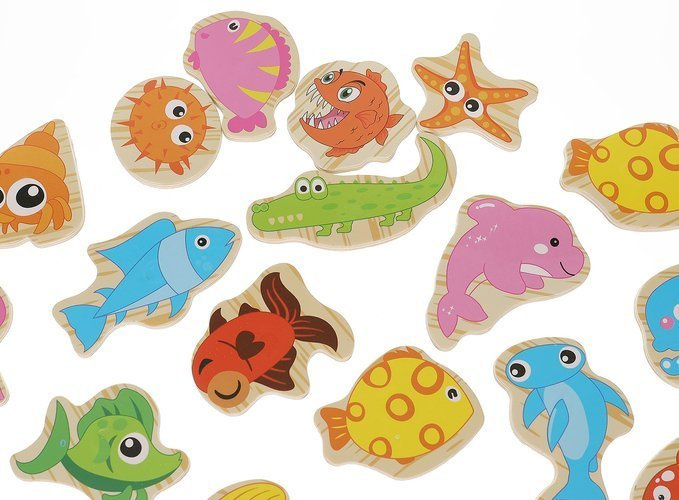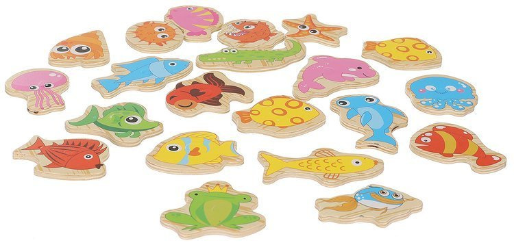 25 elementů – sada obsahuje 22 vodních tvorů s magnety, 2 rybářské pruty s magnety a box, který slouží i jako akvárium. Chytání ryb je díky magnetům jednoduché a zábavné.