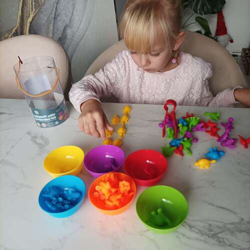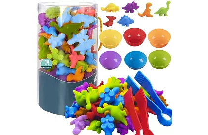 Sada barevných figurek dinosaurů je zábavným a vzdělávacím nástrojem pro malé děti. Pomáhá naučit se počítat a rozpoznávat barvy, zároveň rozvíjí koncentraci, přesnost a manuální zručnost. Živé barvy dinosaurů a kelímků upoutají pozornost dítěte a zaručí dlouhé hodiny zábavy.