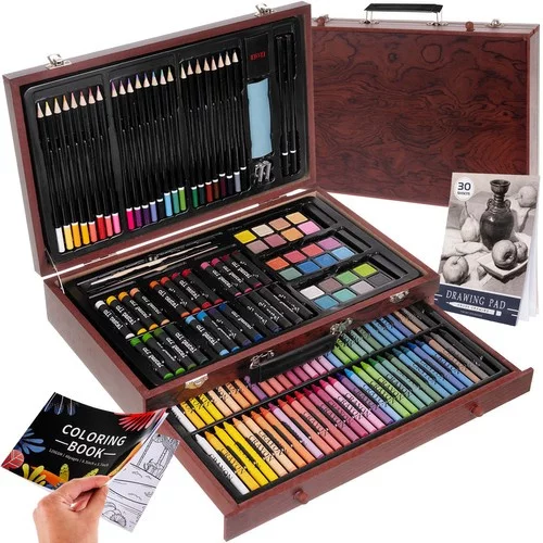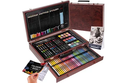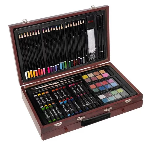 Bohatá výtvarná sada nabízí široké možnosti pro kreslení, malování i kreativní tvorbu. Velký výběr pastelek, barev a doplňků umožňuje vytvářet barevné obrázky, ilustrace i první umělecké projekty. Praktický dřevěný kufr se zámkem a rukojetí udržuje všechny pomůcky přehledně uložené a zároveň umožňuje pohodlné přenášení. Přehledné přihrádky uvnitř kufru zajišťují rychlý přístup ke každému nástroji a pomáhají udržet pořádek. Kreativní set poskytuje ideální prostor pro rozvoj fantazie, kreativity a výtvarných dovedností doma i ve škole.
