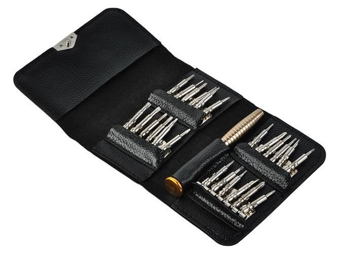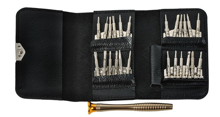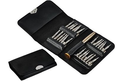 Sada šroubováků obsahuje 25 prvků – 24 hrotů a základní držák – ideálních pro servis a opravy většiny malých elektronických zařízení. Šroubováky jsou uloženy v magneticky uzavřeném pouzdru z ekokůže, které zajišťuje pořádek a zabraňuje ztrátě jednotlivých prvků. Každý hrot je pevně připevněn ke držáku, který umožňuje snadné vyjmutí a bezpečné použití. Sada je vhodná nejen pro opravy telefonů, chytrých telefonů a notebooků, ale také pro práci v hodinářských a klenotnických dílnách, elektroinstalacích či optice.