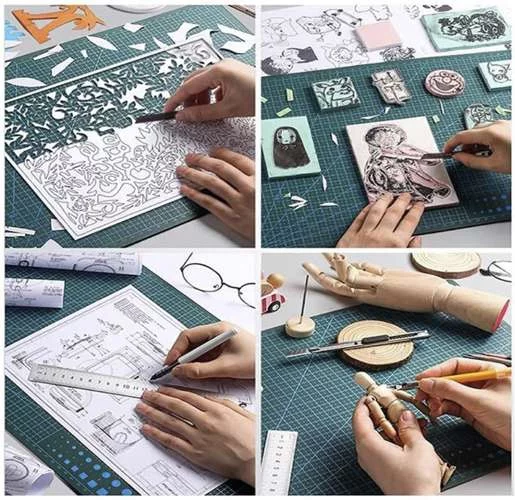 Samoopravná podložka RUHHY je praktický nástroj pro přesné a čisté řezání materiálů formátu A3, jako je papír, karton, fólie, látka nebo houba. Díky speciálním vrstvám samoopravného materiálu se po řezu povrch vrací do původního stavu, což zajišťuje dlouhou životnost a opakované použití. Protiskluzový materiál drží podložku bezpečně na místě a oboustranný potisk s měřítky a čarami usnadňuje přesné řezání a modelování.