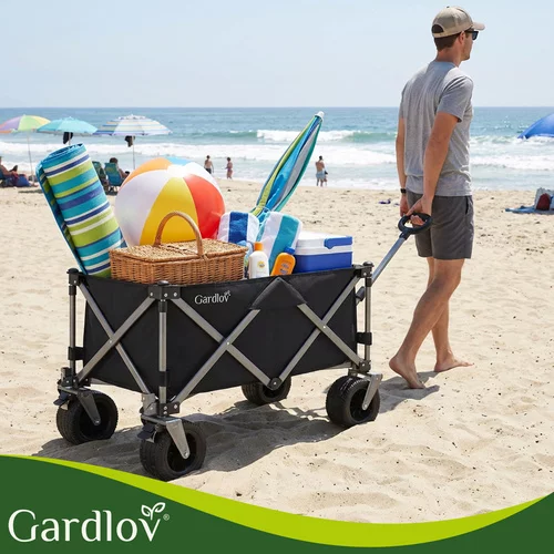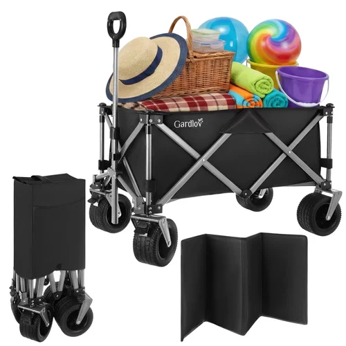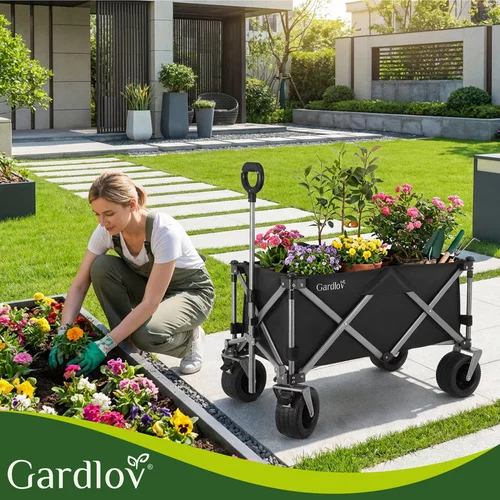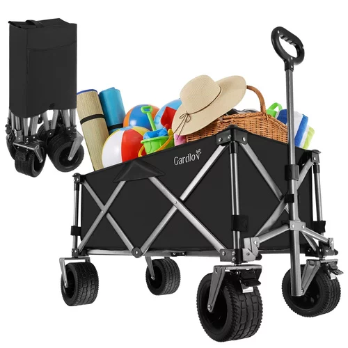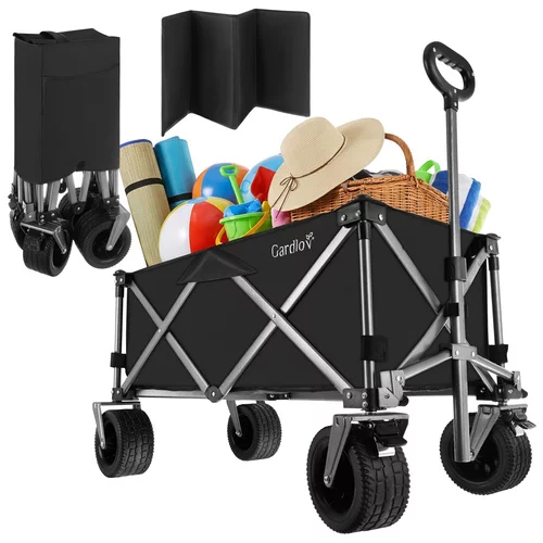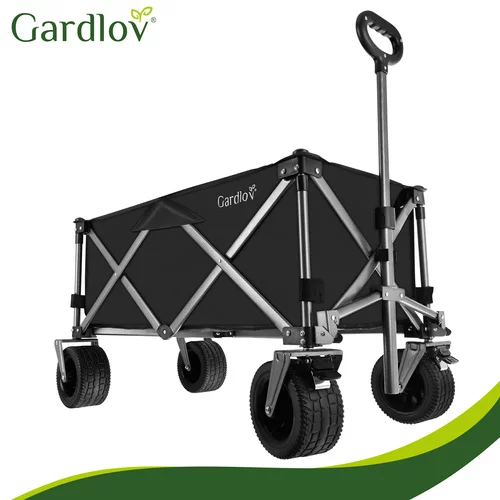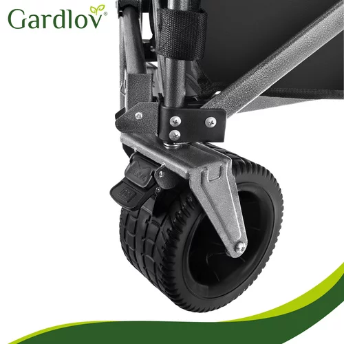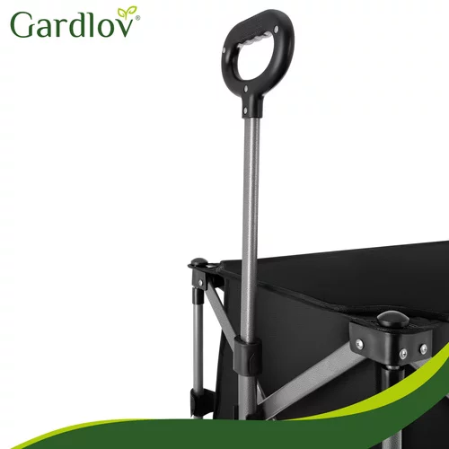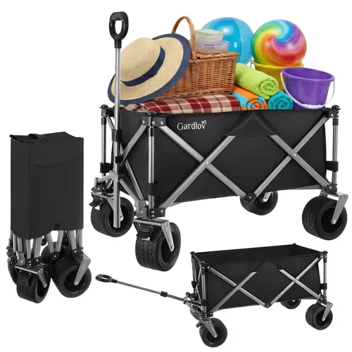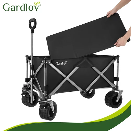 Odolná oxfordská tkanina 600D s PVC zátěrem je voděodolná, pevná a snadno se čistí. Stabilitu zajišťuje robustní rám z práškově lakované uhlíkové oceli a zpevněné harmonikové dno, které brání prohýbání. Široká terénní kola si poradí s pískem, trávou i štěrkem, zatímco přední otočná kola s brzdou umožňují snadné manévrování i při plném zatížení. Nastavitelná rukojeť poskytuje pohodlné ovládání pro uživatele různých výšek.