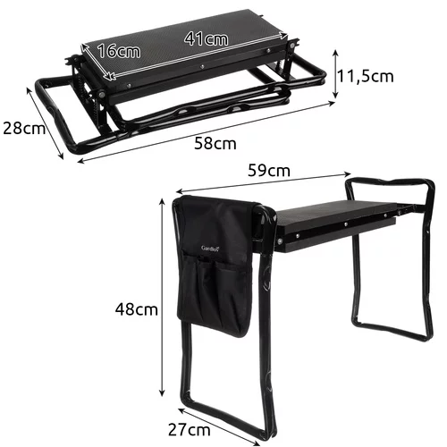 Sedák a klečící plocha jsou pokryty měkkou EVA pěnou, která snižuje tlak na kolena a zajišťuje komfort i při dlouhém sezení. Díky skládací konstrukci je klekátko snadno přenosné a skladné.