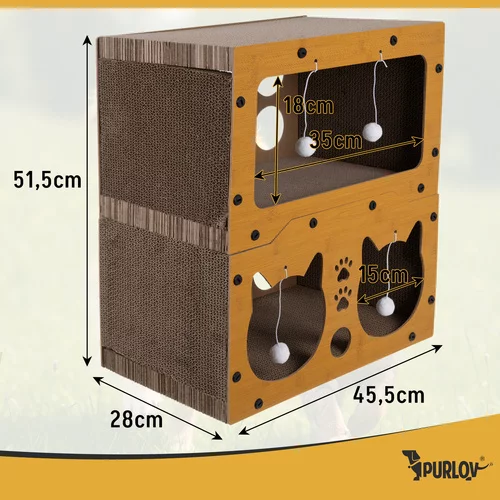 Stylové a praktické místo pro hraní, odpočinek i péči o drápky v jednom. Dvoupatrová konstrukce z pevného HDF nabízí stabilní útočiště pro každodenní relax i aktivitu. Přírodní škrabací povrch pomáhá chránit nábytek a zároveň podporuje přirozené chování koček. Moderní design zapadne do interiéru a vytvoří oblíbený kout pro mazlíčka bez kompromisů.