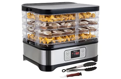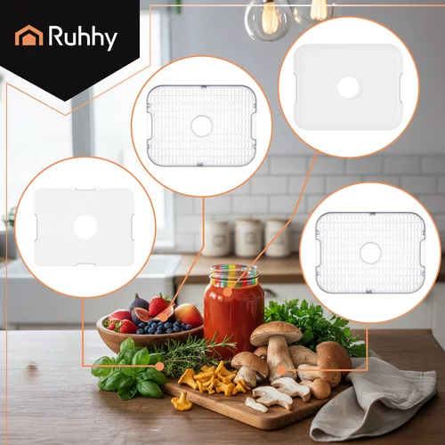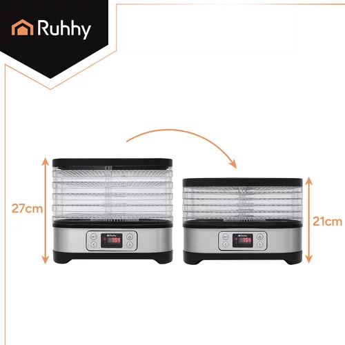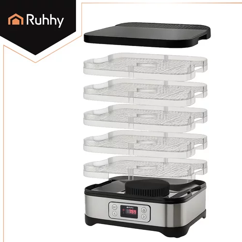 Sušička potravin RUHHY umožňuje snadno připravit domácí zásoby na celý rok. Rovnoměrně suší houby, ovoce, zeleninu i bylinky díky 5 tácům o objemu 10 litrů, přesné regulaci teploty 35–70 °C a 24hodinovému časovači. Přehledný LCD displej a intuitivní ovládací panel zajišťují pohodlné, čisté a energeticky úsporné sušení, zatímco sada praktického příslušenství umožňuje okamžité použití a univerzální zpracování surovin.