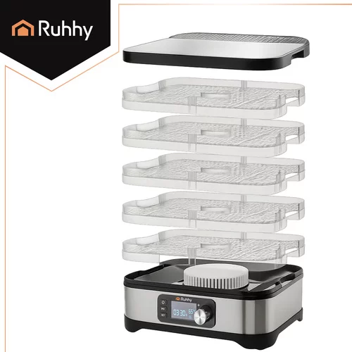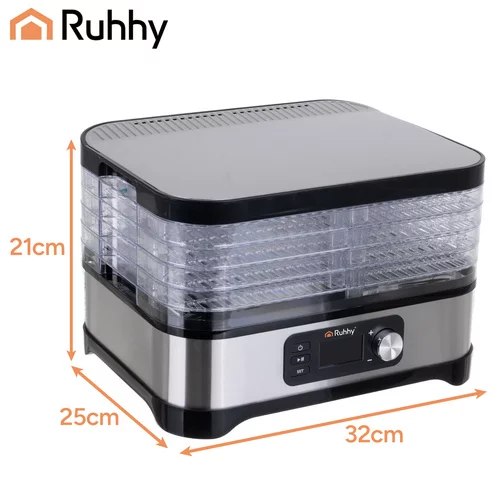 Sušička RUHHY umožňuje rychlé a rovnoměrné sušení hub, ovoce, zeleniny i bylinek. Díky 5 tácům o objemu 10 litrů, regulaci teploty 35–70 °C a 72hodinovému časovači nabízí plnou kontrolu nad procesem sušení. Přehledný LCD displej a intuitivní ovládací panel zajišťují pohodlné, čisté a energeticky úsporné použití. Sada příslušenství obsahuje misky, rošty, nepřilnavé podložky, nůž 3 v 1 a kuchyňské kleště.
