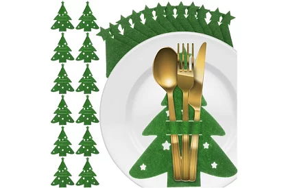 Přineste sváteční atmosféru ke každému stolu s vánočními kapsami na příbory ve tvaru stromečku. Sada 12 pouzder je ideální pro rodinné večeře i větší slavnostní příležitosti. Díky silné plsti jsou pouzdra odolná, stabilní a nemačkají se, čímž zachovávají elegantní vzhled i při delším používání. Intenzivní zelená barva dodává veselou, sváteční náladu a podtrhuje celkovou dekoraci stolu. Kapsy jsou pečlivě vyrobené, zachovávají tvar vánočního stromku a jejich estetika zůstává zachována i po opakovaném použití.